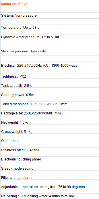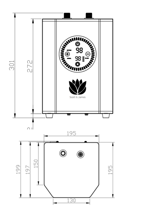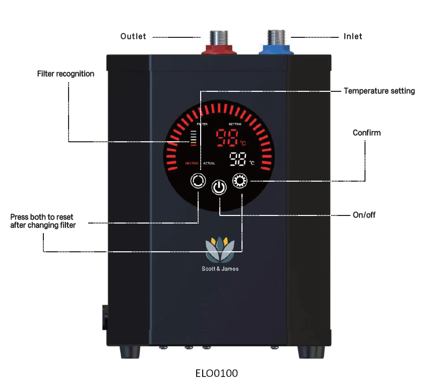 - With a 2 year warranty, that requires the recommended filter change of every 3-6 months depending on usage and water hardness to stay valid. The Scott and James Boiler delivers up to 1.9 litres of water at a temperature of up to 98 degrees through our Scott and James 3 and 4 in 1 Instant hot water taps. For the specifications of the boiler, please check the image below the main image.